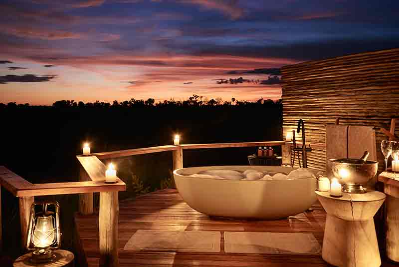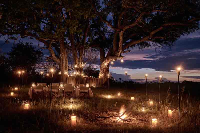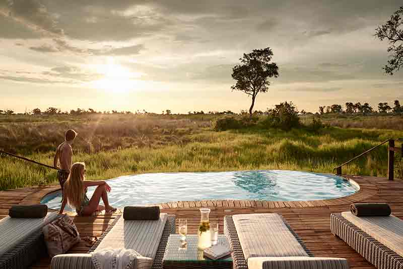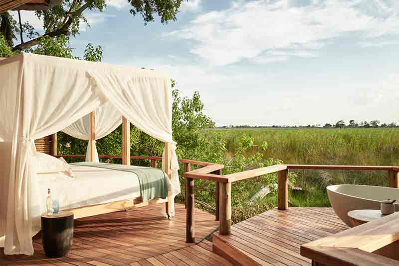 Sanctuary Baines’ was named after the 19th century explorer and painter Thomas Baines. As the smallest camp with just six suites it is the epitome of romance. Each suite rests on an elevated platform in the tree line with both star beds and star bathing. Wooden decks offer expansive views over the permanent water of the Boro River and a lagoon teeming with life. An eco-friendly property, Sanctuary Baines’ Camp was built using only commercially grown wood, with over 150,000 recycled aluminium cans incorporated within the walls to provide insulation.