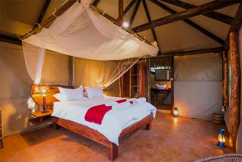 Fig Tree Bush Camps safari tents are all raised 3 meters off the ground providing stunning views over the lagoon and the water hole. Two of the suites are twins and two are double bed, all with en-suite facilities. Each suite has a deck at the front with chairs for relaxing and game viewing from the privacy of your suite.
