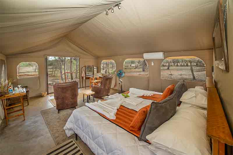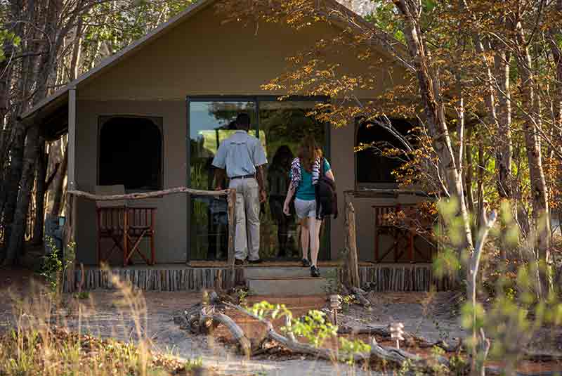 Iganyana Tented Camp is a luxury tented bush camp on an exclusive Big Five concession bordering Hwange National Park. Spacious tents form an attractive arc, each tent with a view over an ancient, long-dry riverbed. Game drives and walking safaris are possible.