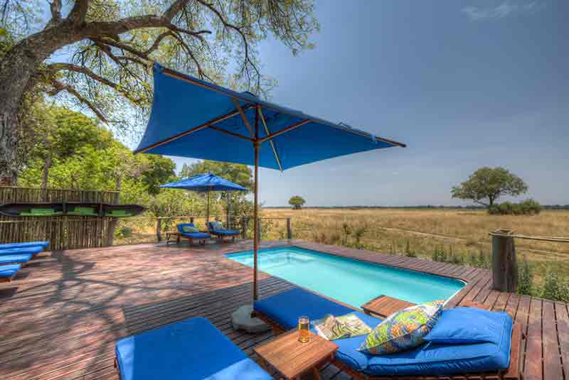 Kadizora Camp is located between the Vumbura River and the Selinda Spillway which is in the remote northern part of the Okavango Delta. The camp overlooks a beautiful seasonal floodplain. Giant Marula trees, Sycamore figs, Jackalberry and Rain trees provide a pleasant shade canopy over the camp. The bar, lounge, reception and dining area ring communal fire pit. From this area there is a wooden walkway leading a swimming pool with views over the floodplain.