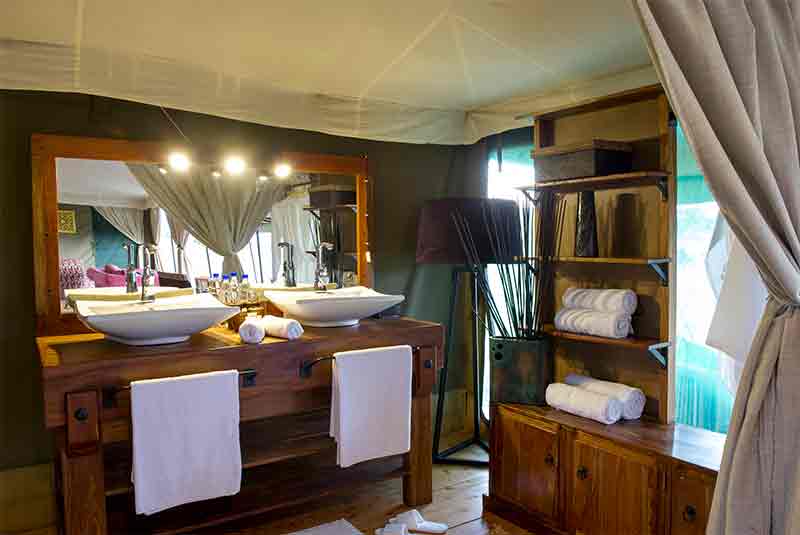 The en-suite bathroom in each tent has double vanity basins, showers and complimentary toiletries for guests.