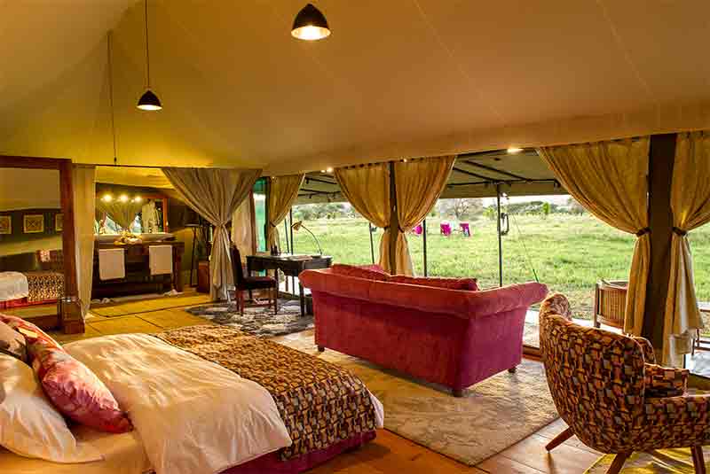 With just 10 tented suites at Kaskaz Mara, plus a honeymoon suite, the camp is small enough to be intimate and give excellent service. Tents all look out over the open plain with a small deck area at the front for relaxing during the day. Beautifully furnished and spacious tents have draped material ceilings, a couch at the entrance and chairs on the front deck.