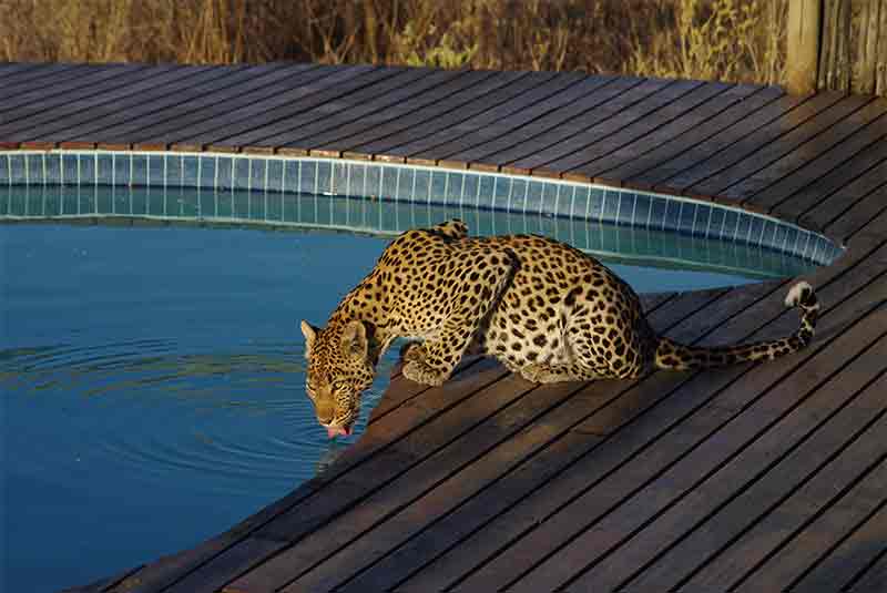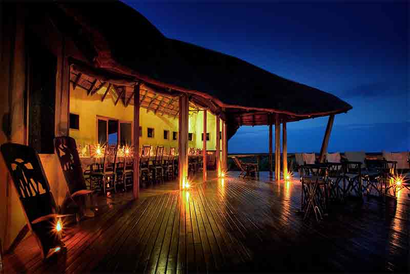The focus of the main guest area is the outside fireplace which happens to be the best location for spotting game at the waterhole. A telescope is available to guests and staff are very happy to assist with identification. The bar, lounge, curio shop and dining area are all clustered around the fire place.