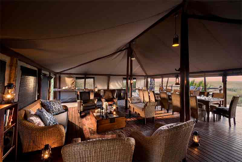 With views out over the swamps and marsh system that stretches to the horizon each of the spacious tents has a private veranda. Linyanti Bush Camp has been created in the traditional safari style. A warm and comfortable main lounge and dining area has an eclectic array of traditional furnishings. Each tent is replete with all the comfortable amenities you would expect. An elevated communal area offers a lounge, bar and dining area with a well-stocked book shelf – this part of the camp is a welcome retreat after a day of activities.