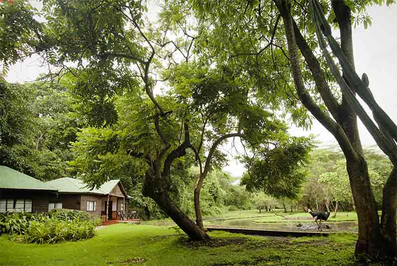 The main house of the lodge has a cozy dining area and bar that leads out to a deck that is shaded by more trees’. At the bottom of the grounds is a swimming pool that is very popular with families and their children. Walking around the lodge there are several places where you can stop, sit down and watch the resident wildlife. Buffalo, Zebra, monkeys and many different birds call this home.