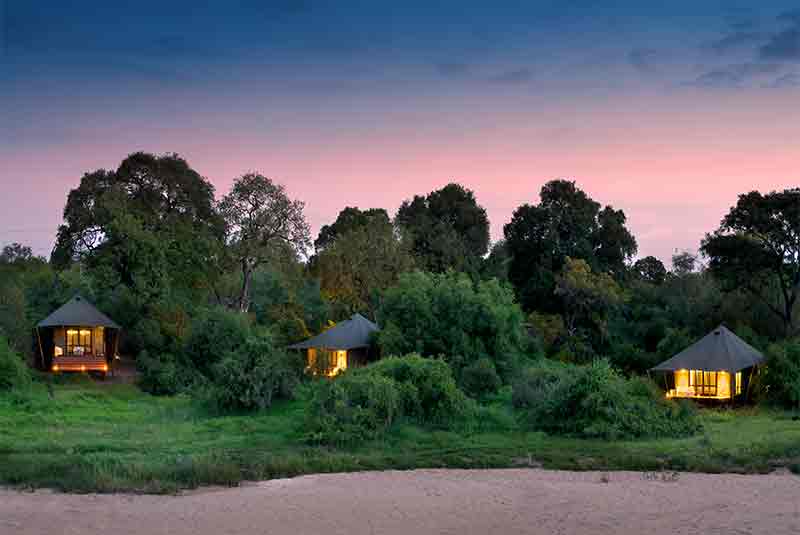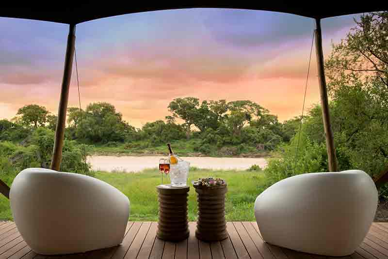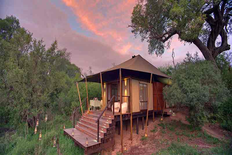 Raised on a platform each tented suite blends into the riverside trees, minimizing the impact on the bush. Indigenous shade trees form a cool canopy overhead and inviting guest areas overlook the seasonal Timbavati River. The camp’s pool, which follows the contours of the riverbank, is perfect for idle afternoon game viewing. The massage sala adds a touch of pure indulgence.