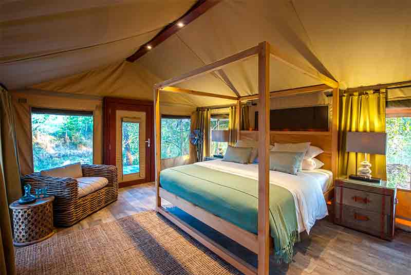 The en-suite bathrooms have double vanity basins and a fantastic rain shower. Two of the tents are linked making them ideal for families on safari with children. These also have a lounge area and private plunge pool.