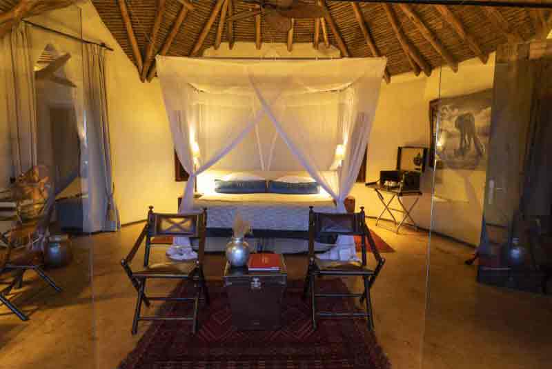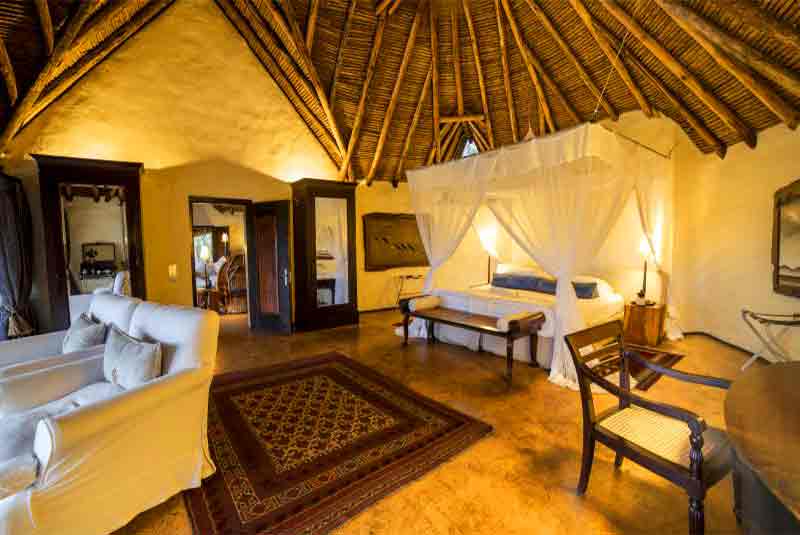 None of the suites is exactly the same. Each has views of Mount Kilimanjaro and the waterhole as well as star beds atop each for sleeping under the night sky. All the suites have private plunge pools and two are connected to create a villa that is ideal for families or couples traveling together. Constructed of local thatch the suites blend with the environment despite their design.