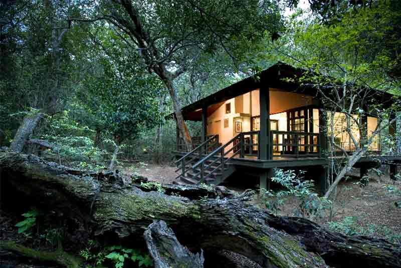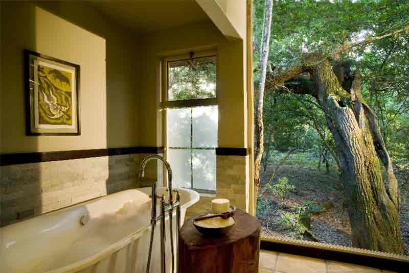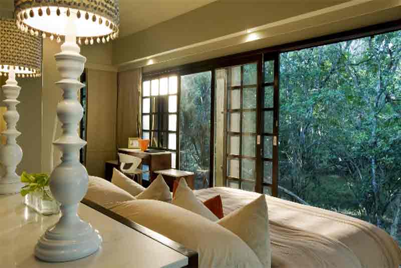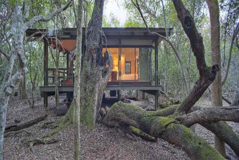 Forest Lodge has just sixteen suites that have been constructed on stilts and appear to float between the forest floor and the Torchwood trees. Each glass-encased suite presents a simplistic decor that incorporates high-gloss wooden floors, rich tactile fabrics and brightly accented Zulu artifacts.