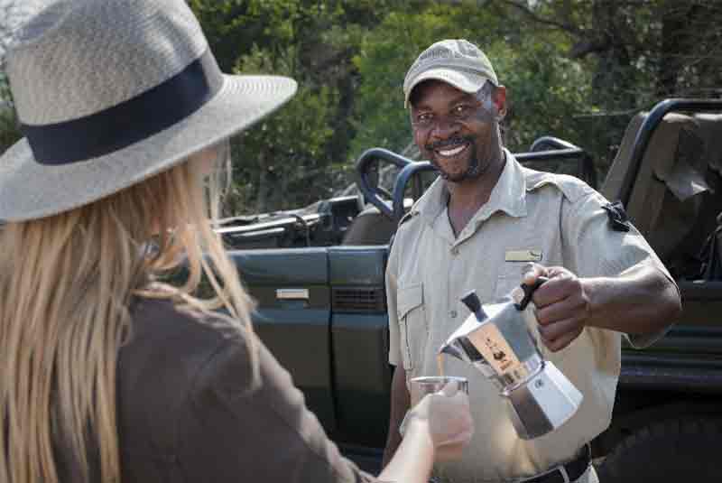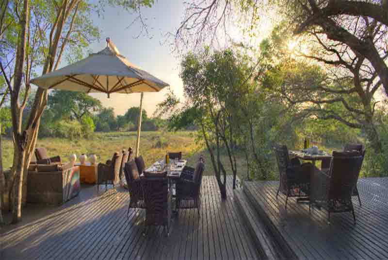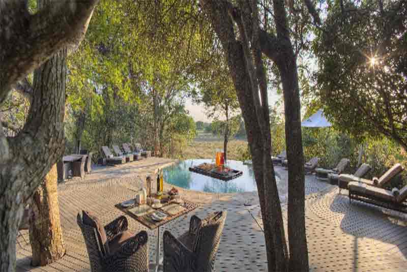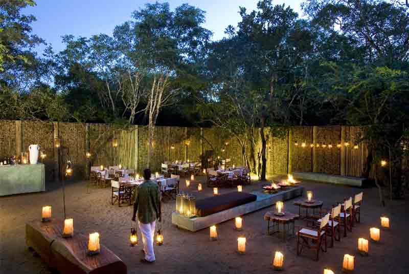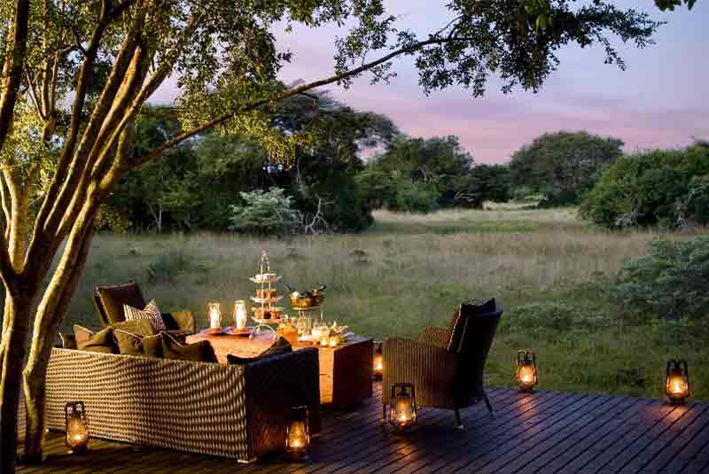 The suites feature luxurious en-suite bathrooms with slate hand basins and viewing decks where guests can drink in the sight of graceful Nyala and Duiker antelope in the dappled shade of the forest. The lodge’s sparkling rim-flow swimming pool, as well as the expansive decks in its seating area, looks out over sweeping views of an open plain. A traditional African boma is enclosed with a wooden fence and offers lantern-lit open-air dining beneath a heaven of stars.