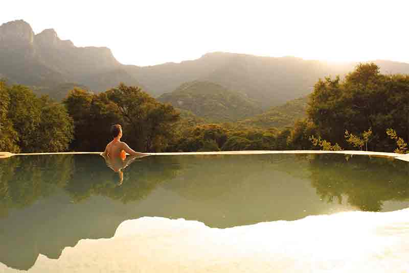 The main guest area has a welcome swimming pool in front of the lounge, bar and dining room. The waterhole below the swimming pool is often visited by wildlife.