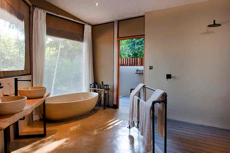 Kigelia House is even larger sitting under a huge canvas roof encompassing two separate and enclosed en-suite bedrooms. The master bedroom has a double bed while the second two single beds that can be converted to a double if needed. Between these two rooms is a lounge sofa and coffee table and a large deck with plunge pool.
