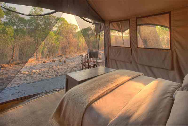 Savuti Under Canvas comprises just five Meru style tents accommodating no more than ten guests. The tents are made of green canvas with mesh windows for a cool breeze and protects you from the mosquitoes at night. A small deck in front is shaded with two chairs and a small table.