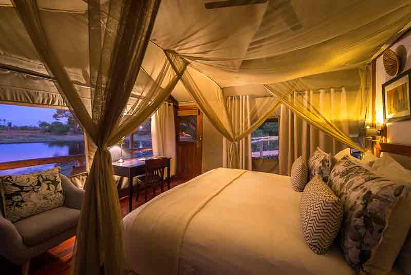 Seba Delta Camp overlooks a perennial lagoon that attracts incredible bird life. Both water and land based activities are offered ensuring an excellent contrast to a classic Okavango Delta experience.This is the best camp for a family safari and is home to Hyena dens, Leopard and Roan antelope.