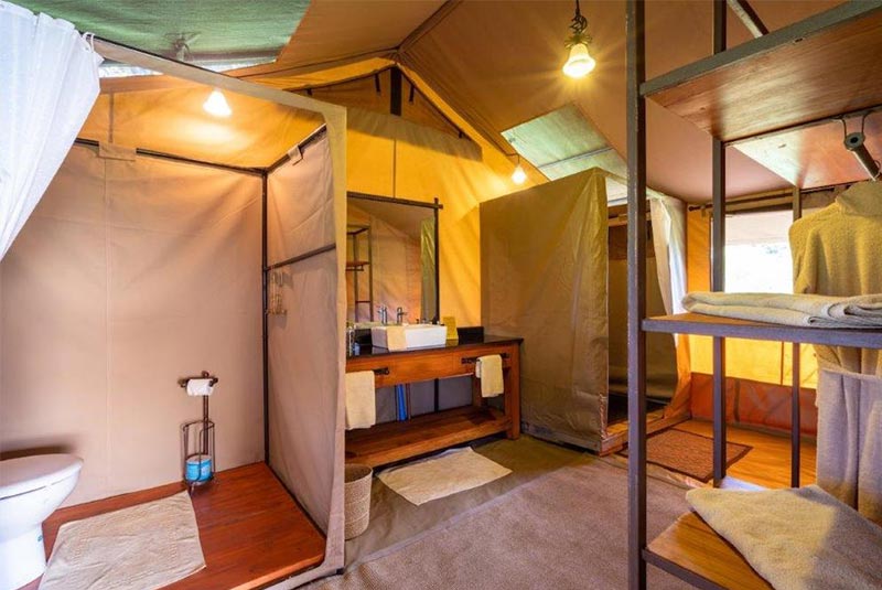 The main guest area is spacious with a lounge, dining room and small bar for evening drinks. Whether you are eating or enjoying the bar views out over the plains are guaranteed. A campfire is lit each evening where everyone congregates before dinner to swap stories of the days adventures.
