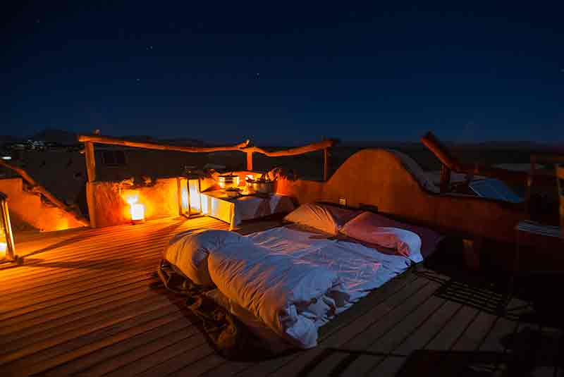 Staff at the lodge made the bed on the flat roof of our cottage, with lanterns and champagne and extra blankets. The skies here are perfectly clear, there is no light pollution and the stars seemed to fill our souls. The silence is also something to behold. But for the barking of Gecko’s, Owls hooting and the occasional jackal it is completely silent. Despite our busy day at Dead Vlei and the Sossusvlei Dunes the experience was too magical for just sleeping. We sipped champagne, whispered about sounds and marveled at the heavens. Truly a unique star bed of Africa.