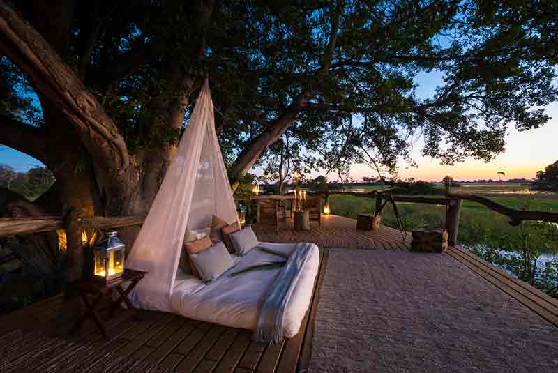 Rates at Tubu Tree Camp start from $1100 per person and includes accommodation, meals, twice daily game drives, laundry, airstrip transfers and park fees’.