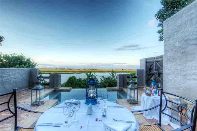 The lodge has been designed to provide a place of tranquility and privacy where relaxation is the focus of your stay here. Six comfortably furnished decks have stunning views across the waters into Namibia and an endless stream of wildlife parades past. A riverside fire area, two bars and four dining locations all combine comfort with luxury. A large swimming pool provides guests with some welcome relief during hot afternoons and the friendly staff are always close to hand for a refreshing drink.