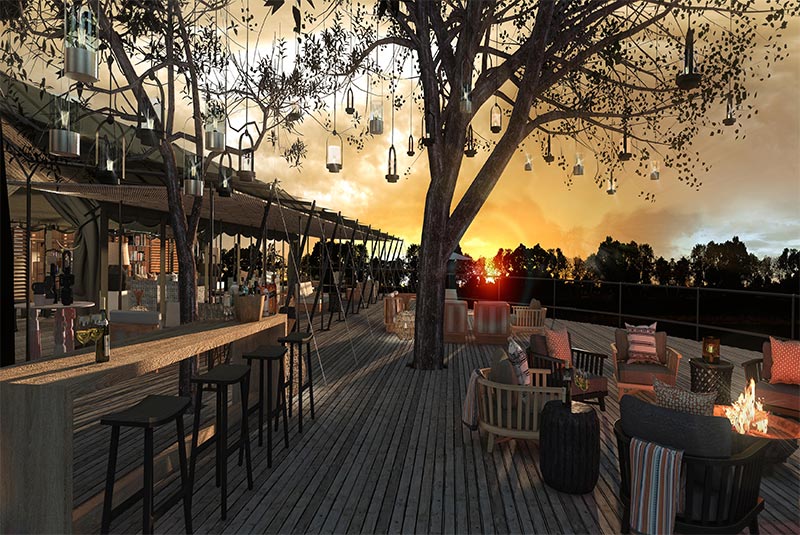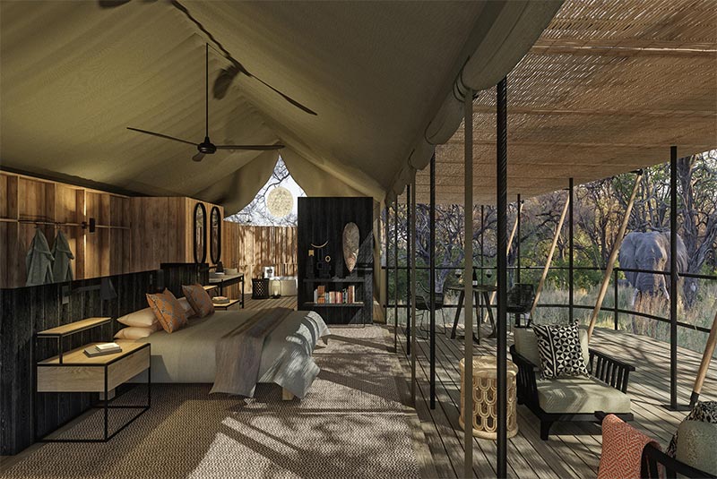 The family tents are two bedrooms, each with their own en-suite bathroom and connected by a central lounge area.