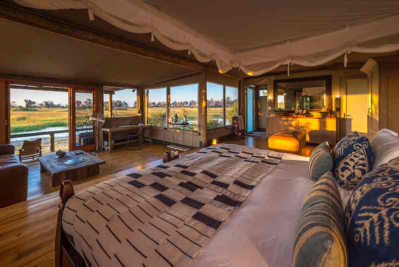 With just six beautiful tented rooms there is an air of stylish exclusivity at Little Vumbura. All the rooms look out over the grasses of the flood plains and a small star gazing deck is off to one side of the main area, close to the dining room. The camp can accommodate 12 guests and 2 children. The family tent has a large double bed while the second room has twin beds, each with en suite bathrooms.