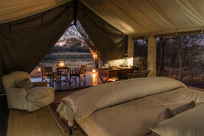 All of the 10 tents at Machaba are set back from the edge of the water with timber frames and a small deck at the front of each. Polished concrete floors of the spacious rooms are adorned with carpets and double or twin beds. Two of the tents are purpose built family tents that are linked and have a bathroom at the back.