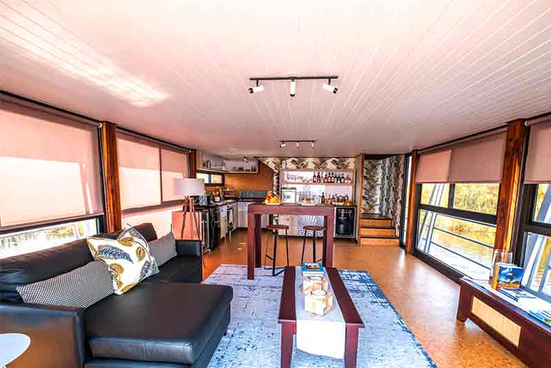 Upstairs there is a bedroom with its own sliding glass doors and deck that has wraparound views. The bathroom too has views of the natural environment, even from the toilet. You will experience true African bliss when tucked into the reeds and surrounded by the peaceful river. Floor-to-ceiling glass on three sides provides spectacular views from nearly every space on the villa.