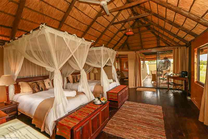 Nehimba has 9 thatched chalets in a half moon around the waterhole and to either side of the main guest area. There are 2 two bed-roomed family suites and a honeymoon suite and all the chalets are built with a combination of canvas and wood with glass windows.