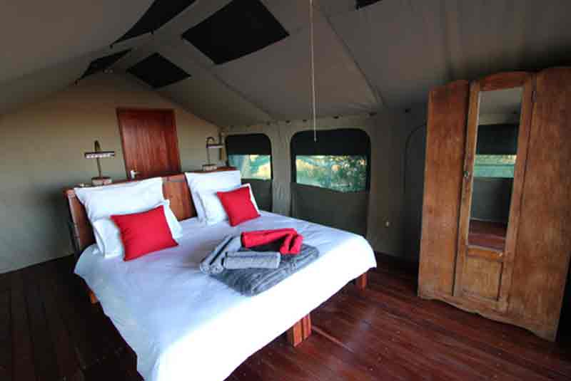 Nkasa Lupala has just 10 tented rooms, all are raised on stilts almost like a treehouse giving sweeping views of the river and marsh in front of the camp. Rooms are simple but comfortable, with double bed, wardrobe and luggage area. Through glass sliding doors in front of the bed is a wooden deck with chairs.
