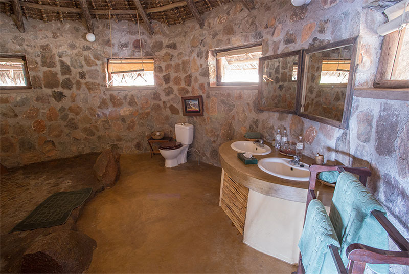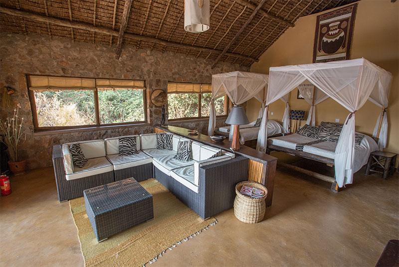 Ruaha River Lodge has 24 stone cottages stretched along the banks of the river. Large double doors greet you on the spacious front veranda that has comfortable chairs for outside relaxing. The interiors of the cottages are very spacious (750 sq feet / 70 sq meters).