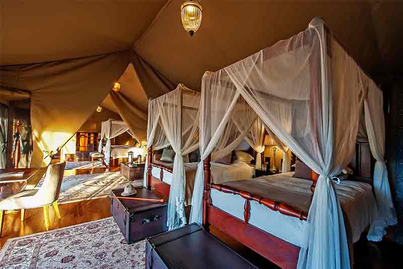 All the tents have been constructed on raised wooden platforms and are very spacious featuring a lounge area with couch and desk. The bedroom is accessible through a canvas flap that can be completely opened during the day, each bed is draped with a full mosquito net.