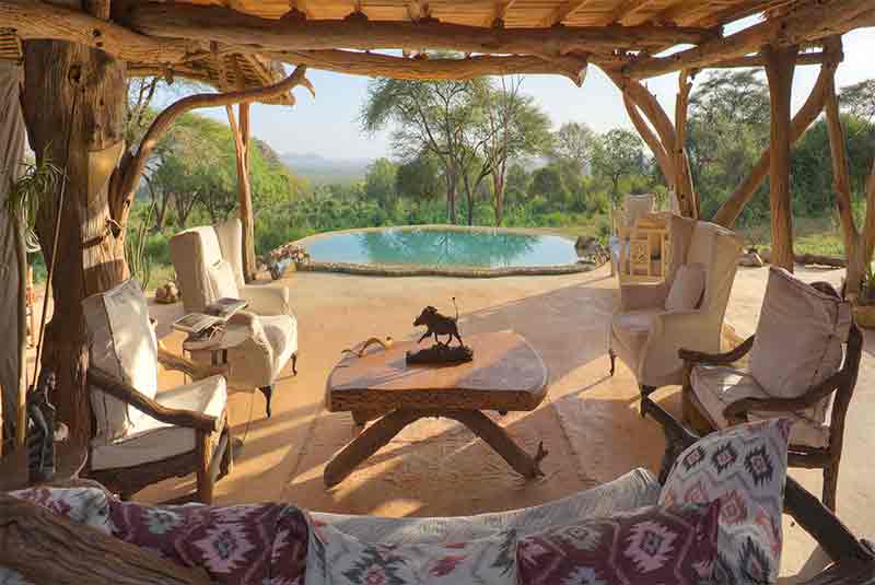 The main guest area of Sarara Camp has been beautifully designed with local materials around the shapes and forms of the rocky cliff face. Below the main lounge and dining area is an infinity pool – most welcome in the hotter months – and below the pool is a waterhole that is very popular with Elephants and other wildlife.