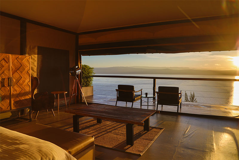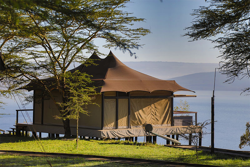 Each of the tented suites is built onto solid foundations and boast incredible views out over Lake Nakuru. While the 180 degree views are panoramic they do not compromise the privacy that each tent enjoys. Each tent is very spacious with the front able to open up completely where a coffee table and two chairs wait for you to relax in.