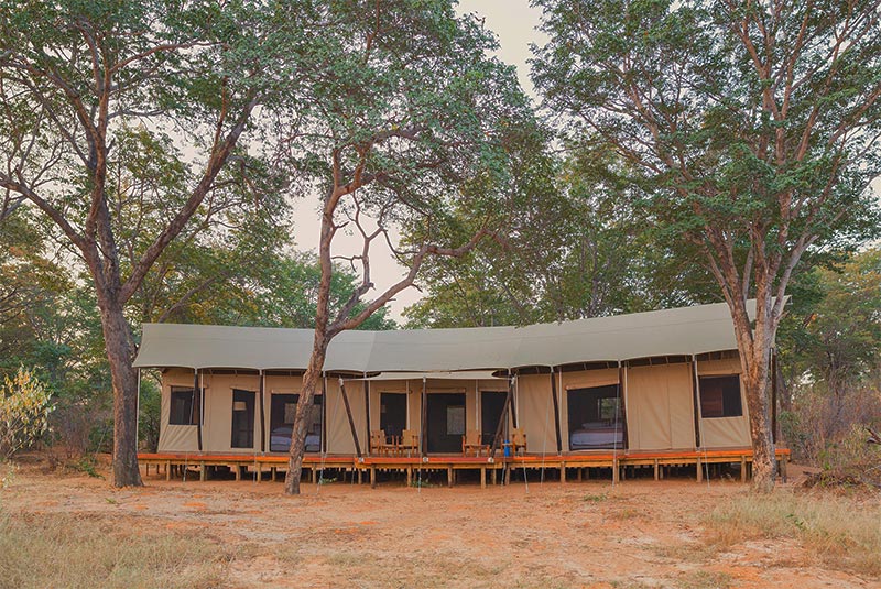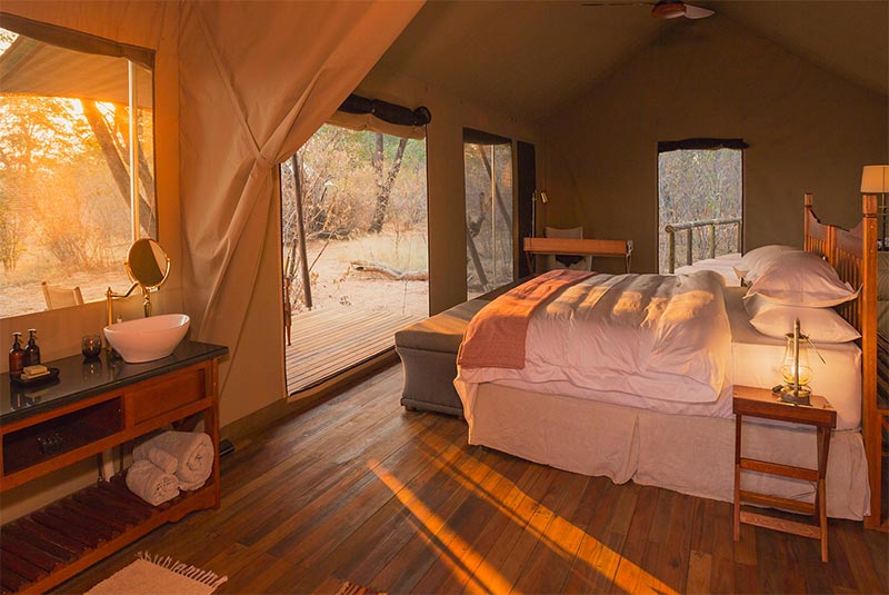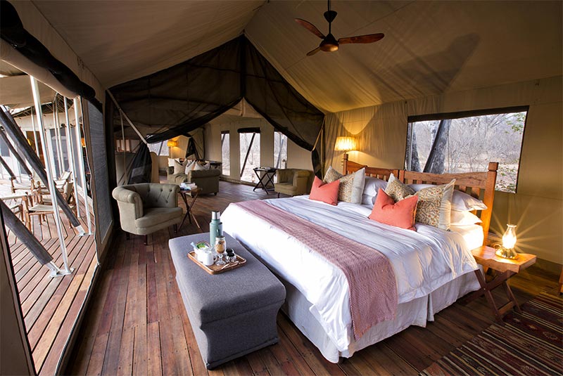 The 10 tents at Verney’s are shaded by the Mopane and Teak trees’ made from canvas with absolutely fantastic finishes. The interiors are spacious and warm with amble space outside on the deck for comfortable chairs and relaxing between game drives.