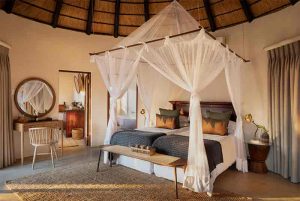 The suites here are accessed via wooden walkways that lead down to the rooms and are a pavilion style of design with either king size or twin beds. Each suite has a private deck looking out over the river bed and dam as well as a day bed with curtains, ideal for a lazy afternoon siesta between game drives.
